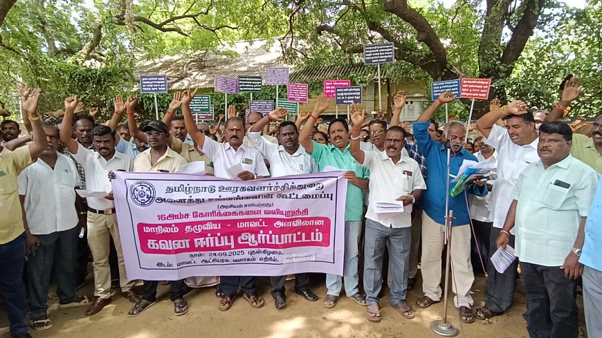 திருச்சி கலெக்டர் அலுவலகம் அருகே 16 அம்ச கோரிக்கைகளை வலியுறுத்தி தமிழ்நாடு ஊரக வளர்ச்சித்துறை அனைத்து சங்கத்தின் கூட்டமைப்பு ஆர்ப்பாட்டம் நடைபெற்றது