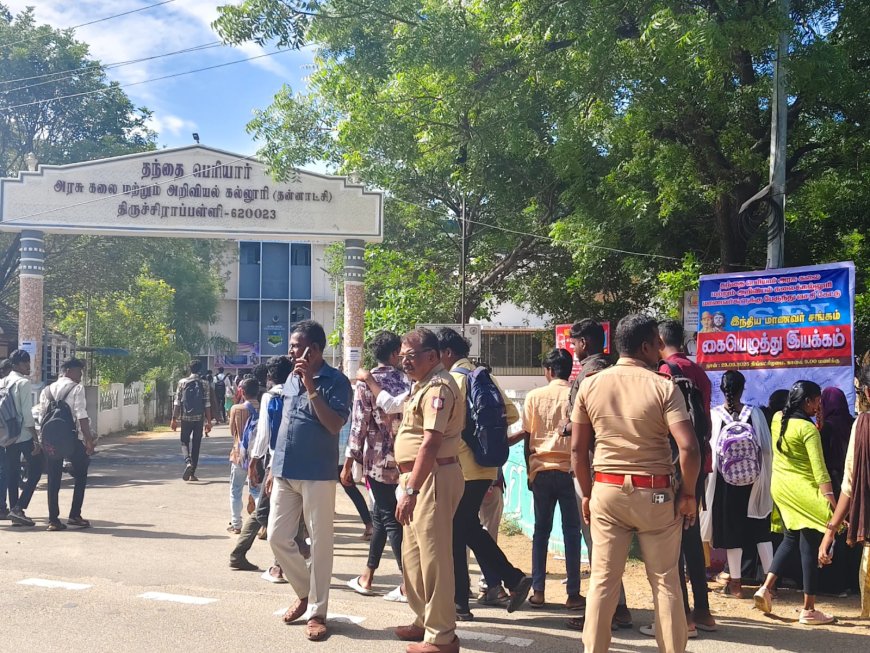 குறிப்பாக, கல்லூரி நேரத்தில் அதிக நெரிசல் காணப்படுவதால் மாணவர்கள் பேருந்துகளில் ஏற முடியாமல், படிப்பில் பாதிப்பு அடைகிற நிலை ஏற்பட்டுள்ளது. இந்த பிரச்சினையை கடந்த காலங்களில் பலமுறை இந்திய மாணவர் சங்கம் எடுத்துரைத்தும், அவ்வப்போது சில கூடுதல் பேருந்துகள் இயக்கப்பட்டாலும், பின்னர் மீண்டும் பழைய நிலை தொடர்கிறது. திருச்சி மத்திய பேருந்து நிலையம் பஞ்சப்பூர் மாற்றப்பட்டதற்கு பிறகு இன்னும் சிரமம் அதிகரித்துள்ளது இதனால் மாணவர்கள் சிரமப்பட்டு வருகின்றனர் மன்னார்புரத்திலிருந்து தினமும் நடந்து வரக்கூடிய அவல நிலை உள்ளது மாணவர்கள், “ தினமும் கல்லூரி செல்லும் போதும், வீடு திரும்பும் போதும் மிகவும் கஷ்டப்படுகிறோம். மாணவர்களுக்கு நிரந்தரமாக போதுமான பேருந்து சேவைகள் வழங்க அரசு மற்றும் போக்குவரத்து துறை உடனடி நடவடிக்கை எடுக்க வேண்டும்” என்று இந்திய மாணவர் சங்கம் சார்பில் தந்தை பெரியார் அரசு கலை மற்றும் அறிவியல் கல்லூரி நுழைவாயில் முன்பு கையெழுத்து இயக்கம் மாவட்ட தலைவர் ஜி.கே.மோகன் தலைமையில் நடைபெற்றது மாவட்ட துணை தலைவர்கள் அன்பு,மாவட்ட துணை செயலாளர் ஆர்த்தி,சுதேசனா, மாவட்டக்குழு உறுப்பினர்கள் சாலினி கிளை நிர்வாகி பூபதி,தேவா ஆகியோர் கலந்து கொண்டனர் ஏராளமான கல்லூரி மாணவர்கள் கலந்து கொண்டு கையெழுத்திட்டனர்