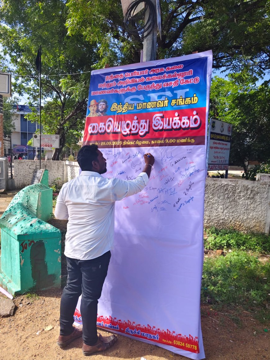 திருச்சி தந்தை பெரியார் கல்லூரி மாணவர்கள் பேருந்து வசதி ஏற்படுத்தி தர கோரி இந்திய மாணவர் சங்கம் கல்லூரி வாயில் முன்பு கையெழுத்து இயக்கம்